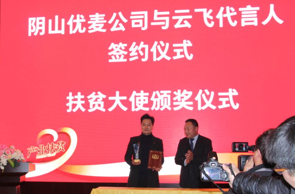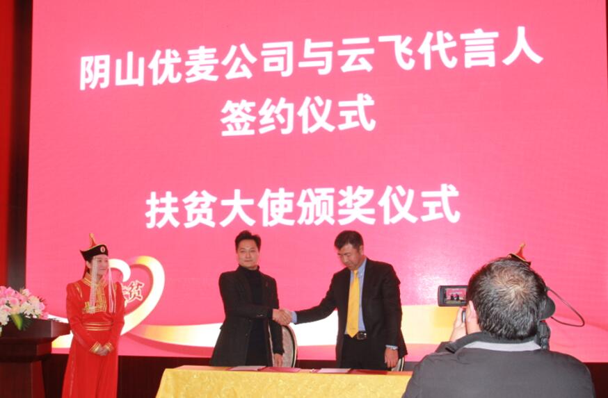 會上,陰山優(yōu)麥與云飛簽訂品牌代言協(xié)議,并由劉超旗長為云飛頒發(fā)“扶貧大使”證書和獎杯,并希望他發(fā)揮號召作用,繼續(xù)助推地方特色產品,提升市場認知度。云飛在發(fā)言中講到,內蒙古的農畜產品,尤其像陰山優(yōu)麥這種地方特色產品深受社會各界的喜愛。同時表示,作為公司的代言人,日后定會為產品的宣傳推廣作出積極的努力。