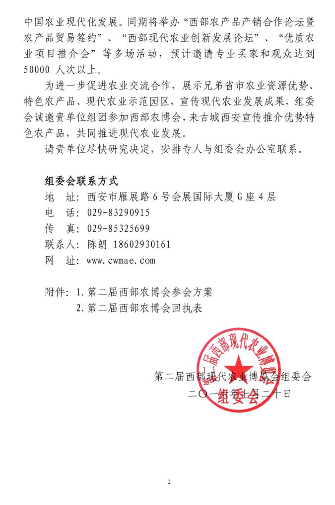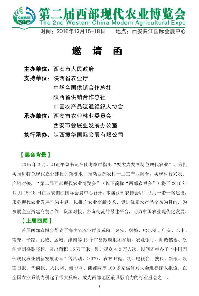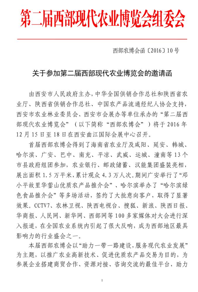 關(guān)于參加第二屆西部現(xiàn)代農(nóng)業(yè)博覽會(huì)的邀請函
