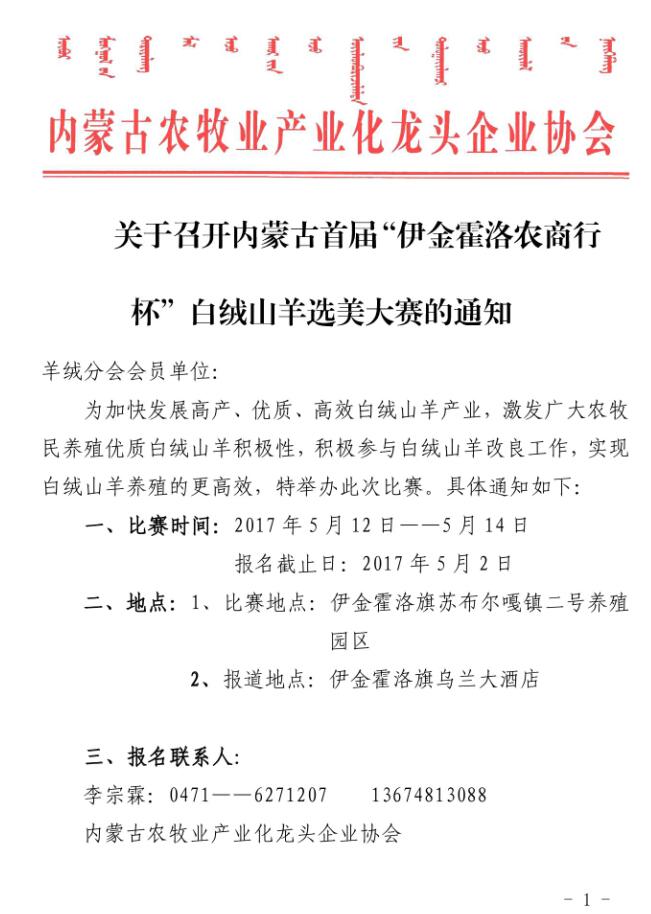 關(guān)于召開(kāi)內(nèi)蒙古首屆“伊金霍洛農(nóng)商行杯”白絨山羊選美大賽的通知