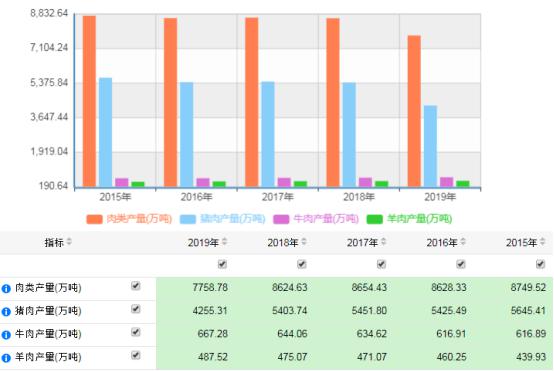 全國(guó)2015-2019年牛、羊、豬產(chǎn)量情況