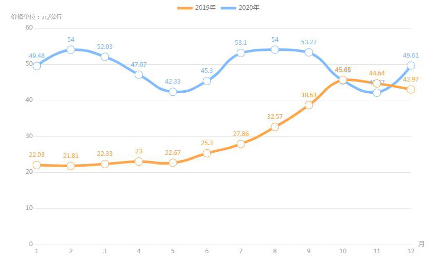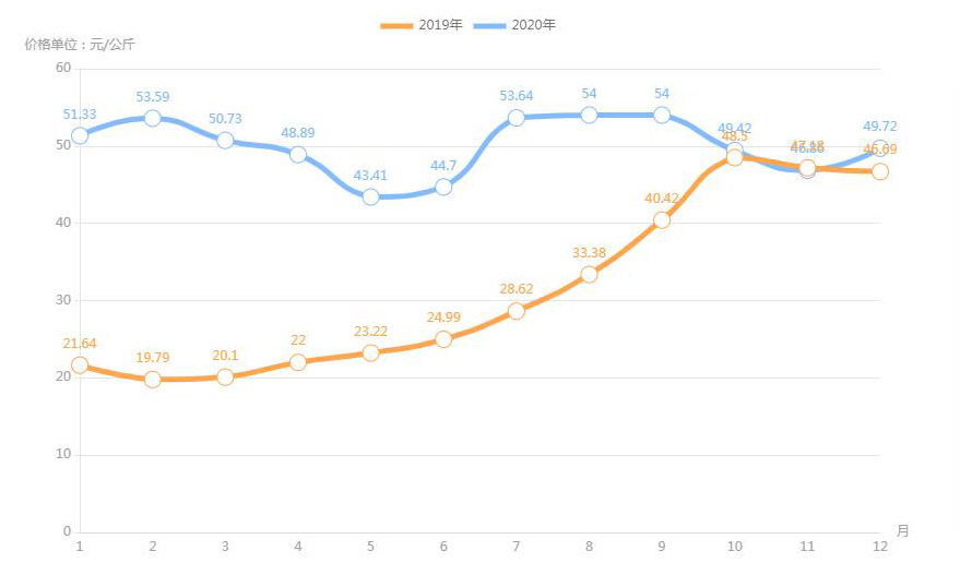 2020年中國(guó)生豬及豬肉價(jià)格走勢(shì)圖: