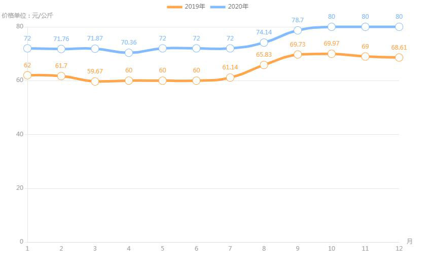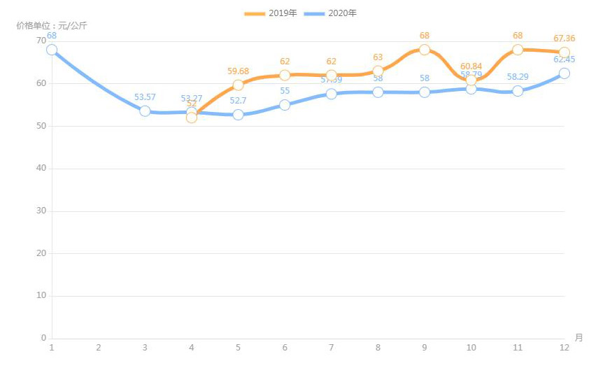 對(duì)內(nèi)蒙古幾大農(nóng)貿(mào)批發(fā)市場(chǎng)羊肉價(jià)進(jìn)行匯總分析得出:呼和浩特市內(nèi)蒙古美通農(nóng)產(chǎn)品批發(fā)市場(chǎng)羊肉最高價(jià)格出現(xiàn)在2020年11月68元/公斤,最低價(jià)格出現(xiàn)在2019年4月52元/公斤。呼和浩特市東瓦窯批發(fā)市場(chǎng)羊肉最高價(jià)格出現(xiàn)在2020年12月73.38元/公斤,最低價(jià)格出現(xiàn)在2019年5月61.08元/公斤。包頭市友誼蔬菜批發(fā)市場(chǎng)羊肉最高價(jià)格出現(xiàn)在2020年12月67.16元/公斤,最低價(jià)格出現(xiàn)在2019年3月54元/公斤。內(nèi)蒙古赤峰西城市場(chǎng)羊肉最高價(jià)格出現(xiàn)在2019年9月75.52元/公斤,最低價(jià)格出現(xiàn)在2019年3月56.97元/公斤。羊肉價(jià)格和去年同期相比整體上漲,漲幅基本在每公斤5-15元左右。